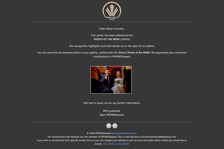 Sunt onorat să anunț că, la data de 25 ianuarie 2025, una dintre fotografiile mele, selectate anterior ca „Picture of the Day” de platforma internațională ProWed Award, a fost ulterior inclusă și în selecția „Picture of the Week”.